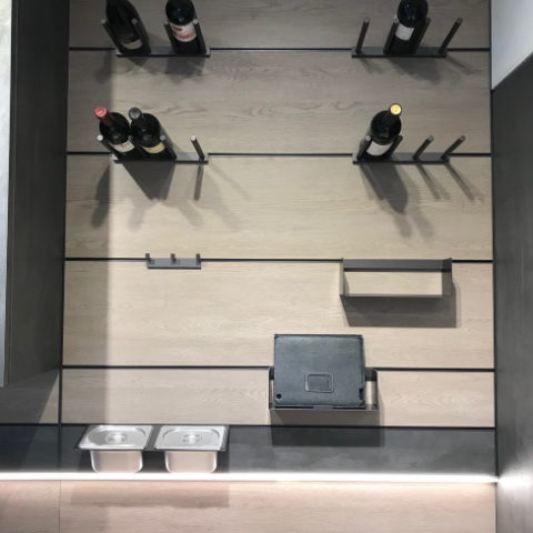 Accessori boiserie Line System: portabottiglie, ganci, portarotolo, contenitori, vaschette con coperchio, supporto tablet