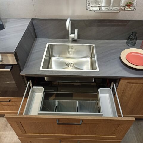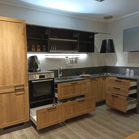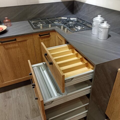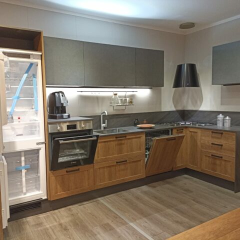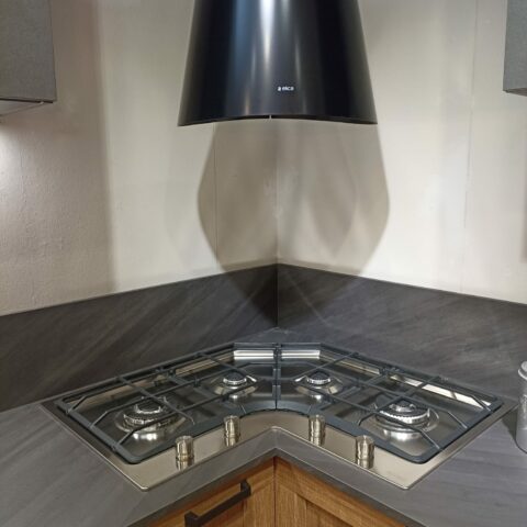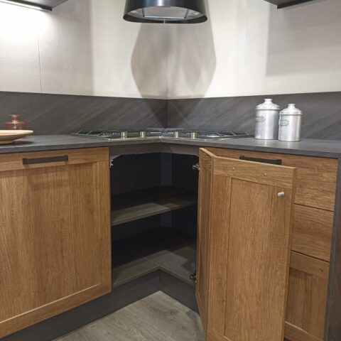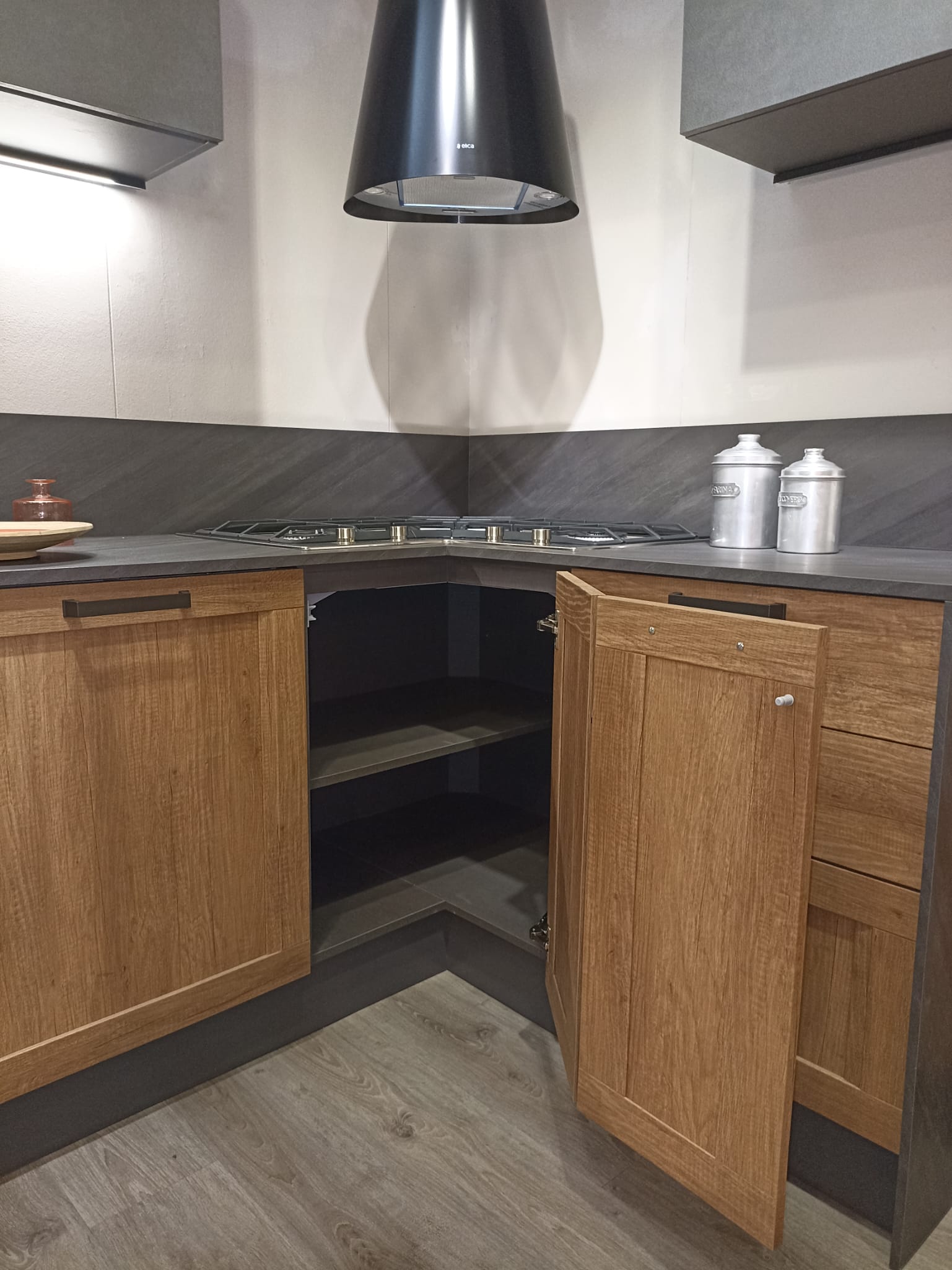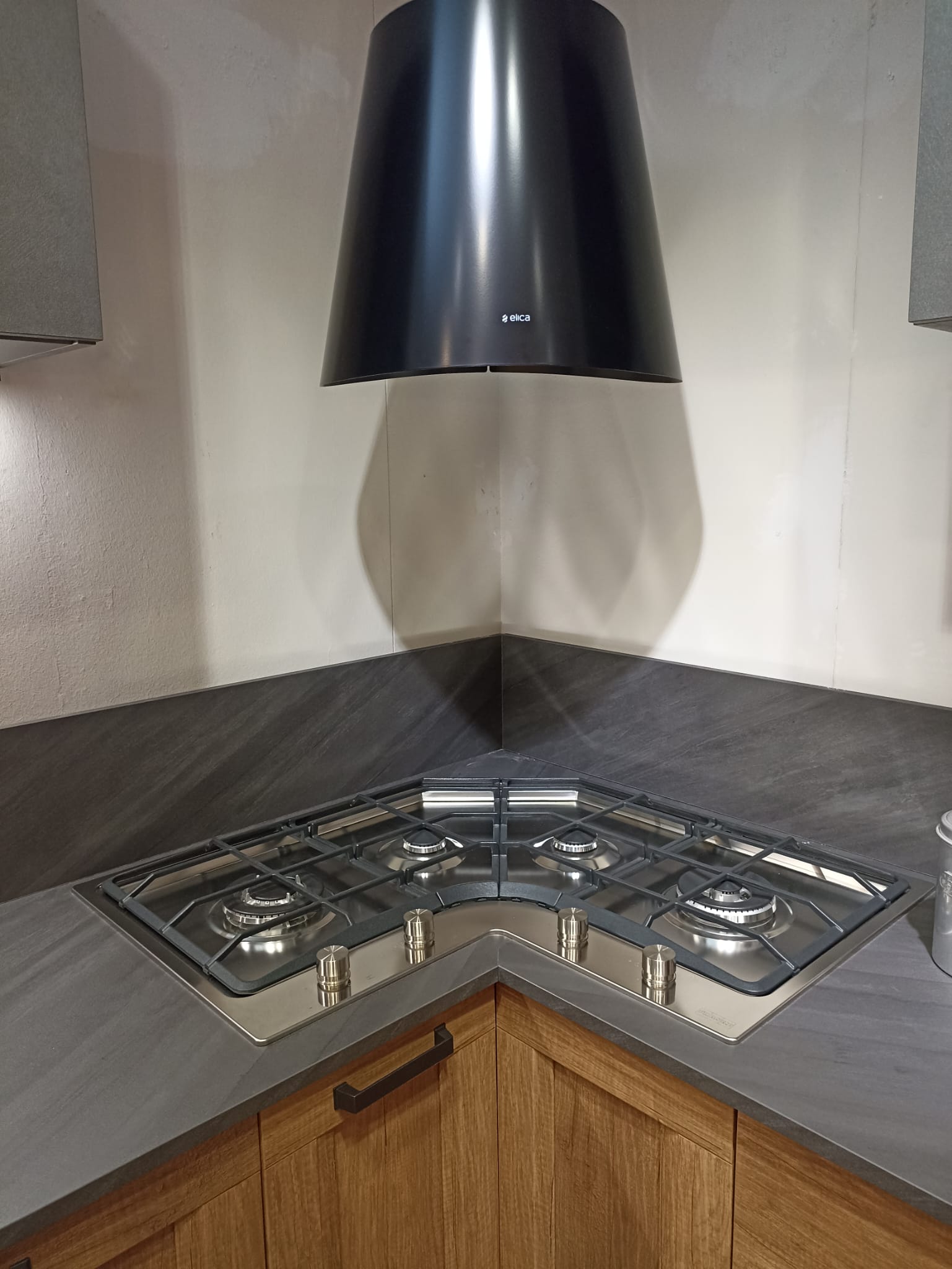 La soluzione angolare con piano cottura ad angolo, proveniente dalla nostra esposizione, è completa di elettrodomestici e accessori funzionali.