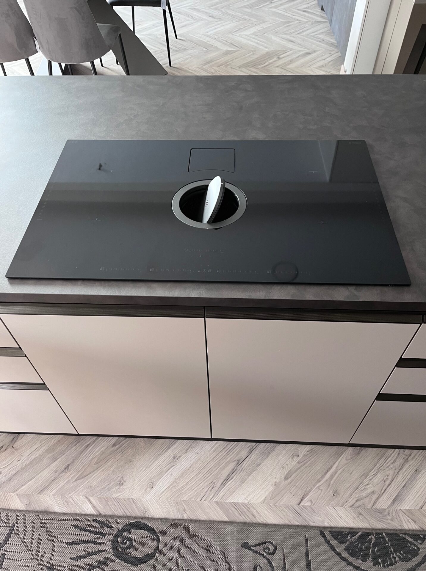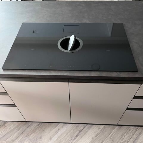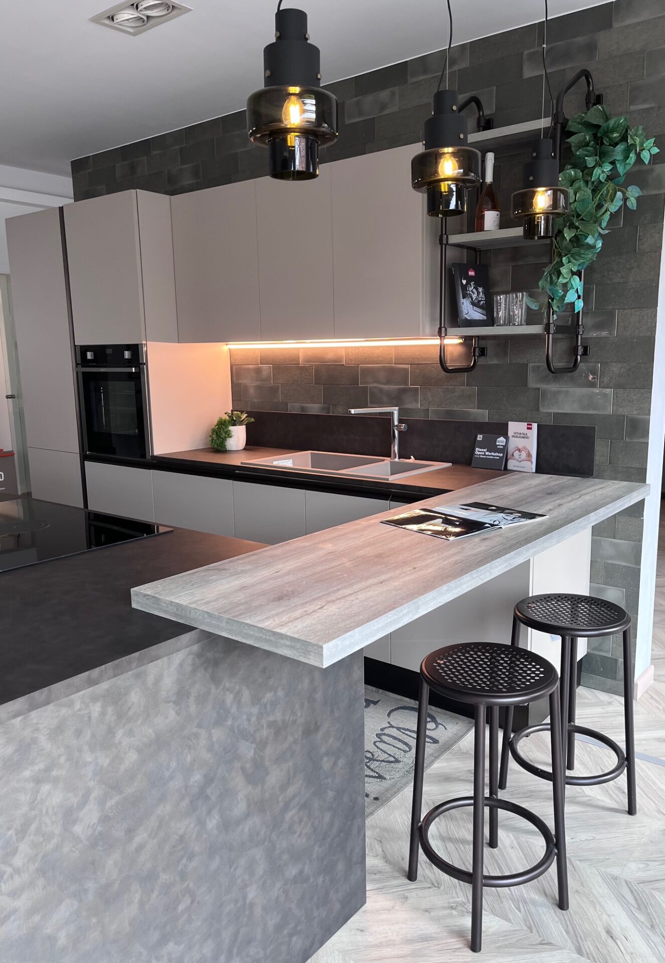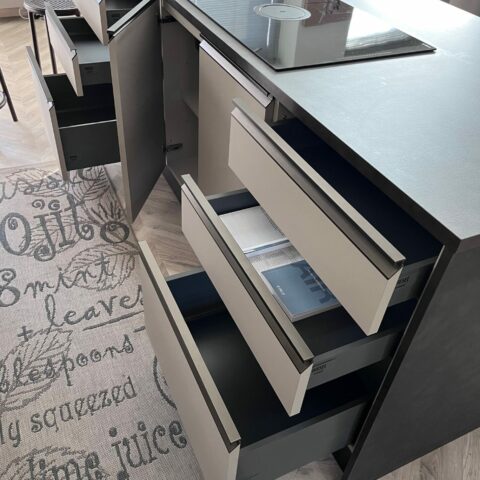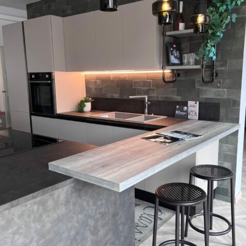 Piano lavoro cucina Sp 3 cm e schienale H 20 cm in laminato colore Metallic Touch; piano snack in laminato Sp 4 cm colore Rustic Grey.