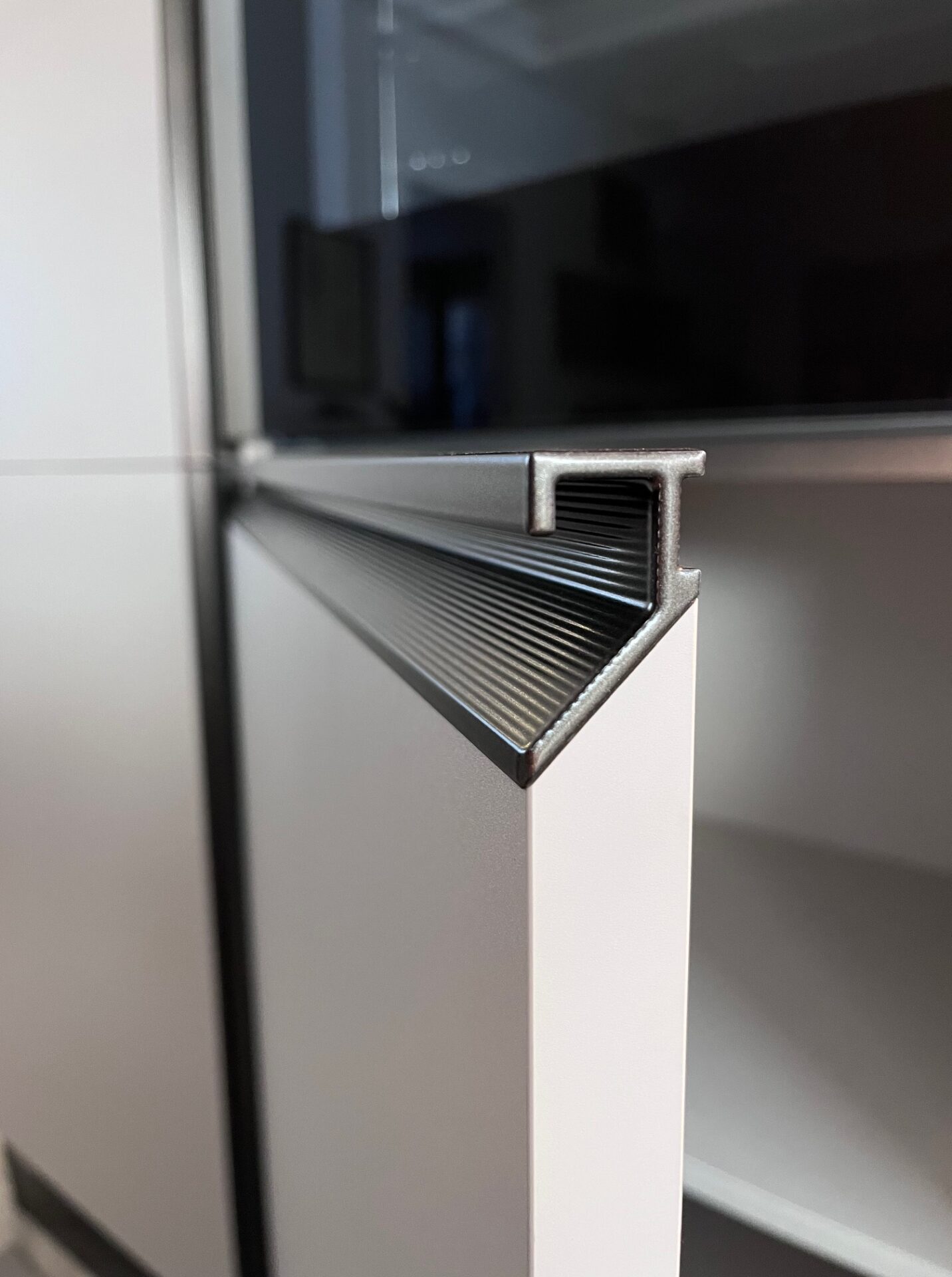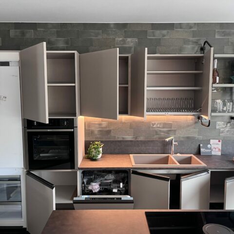 Frontali cucina Sp 22 mm finitura decorativo colore Soft Greige, frontali retro isola Sp 22 cm con telaio in metallo Bronzo e vetro Smoky Glass.