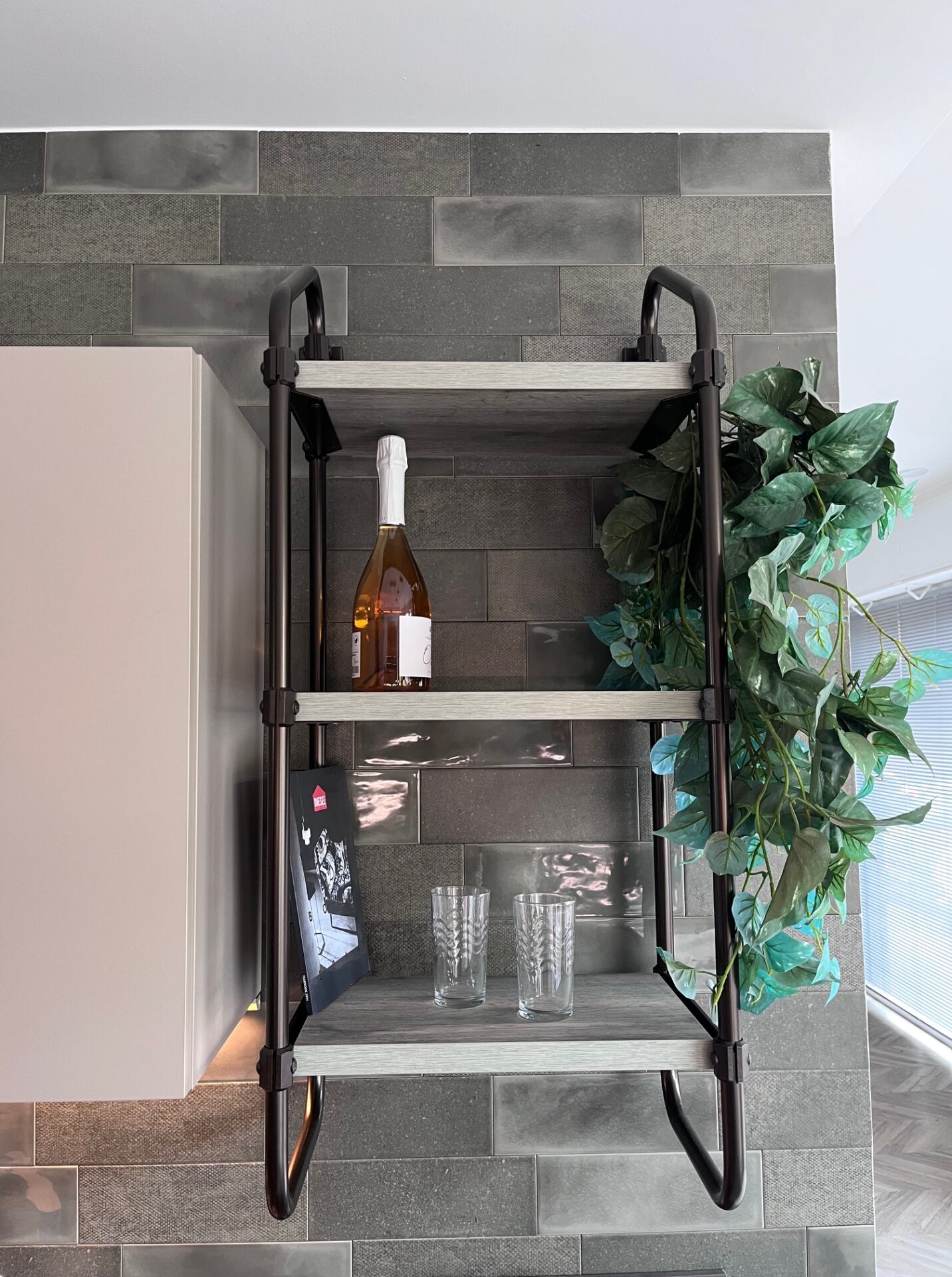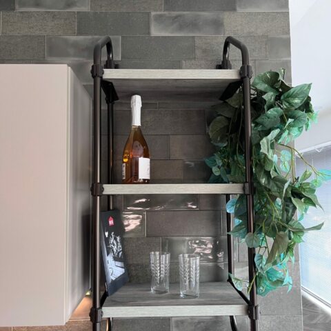 Pensile Sistema Rack con fianchi metallo colore Bronzo e mensole laminato Rustic Grey.
