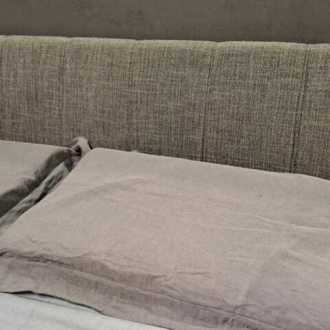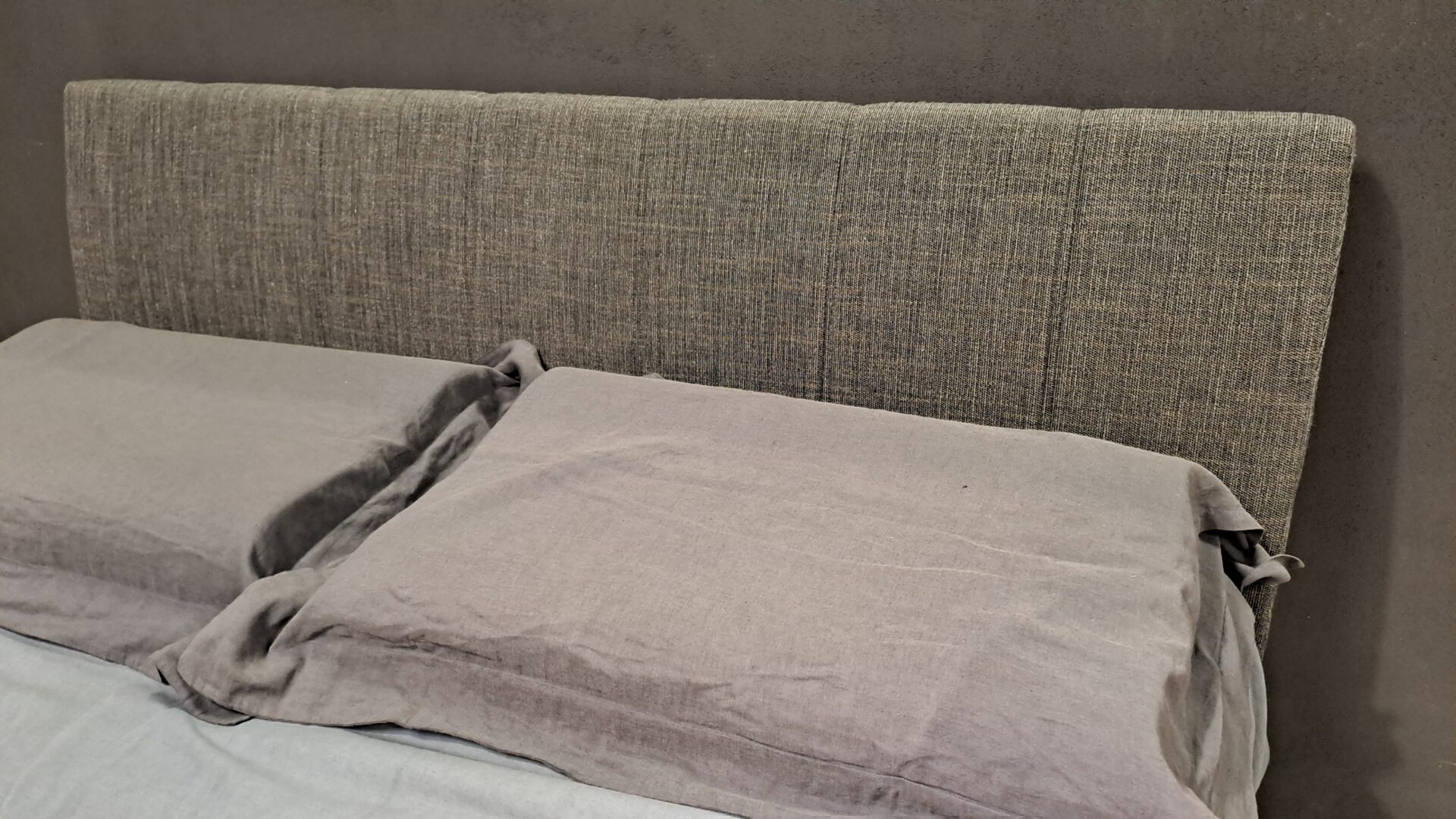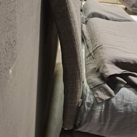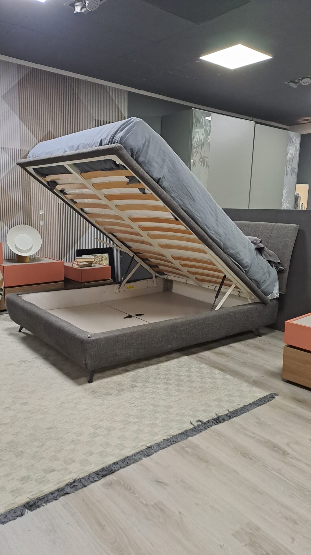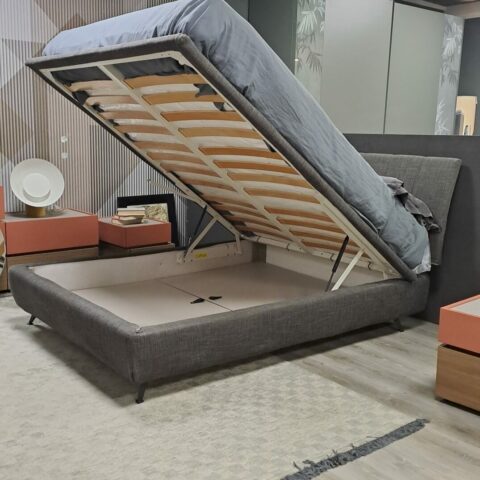 Letto Tomasella Seven con contenitore; rivestimento sfoderabile in tessuto Favola 26; piedi mini Victor Antracite; rete 160×200 cm.